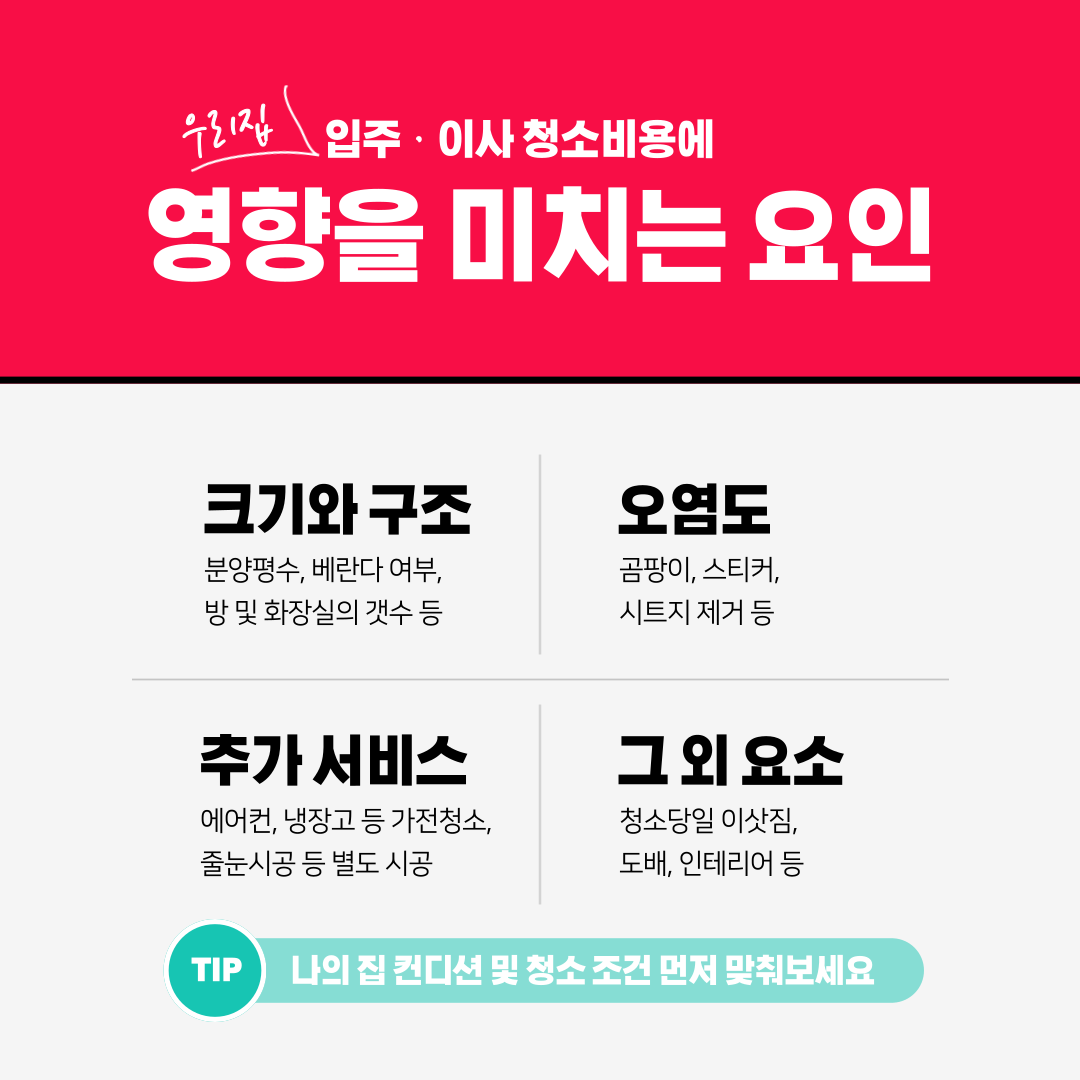 입주청소비용에는 다음과 같은 여러 요인이 영향을 미칩니다: