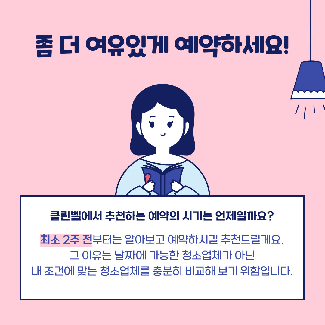 충분히 비교하고 내가 원하는 청소업체를 예약하기 위해서는 어느정도 여유를 두고 청소업체를 알아보는 것이 좋습니다.