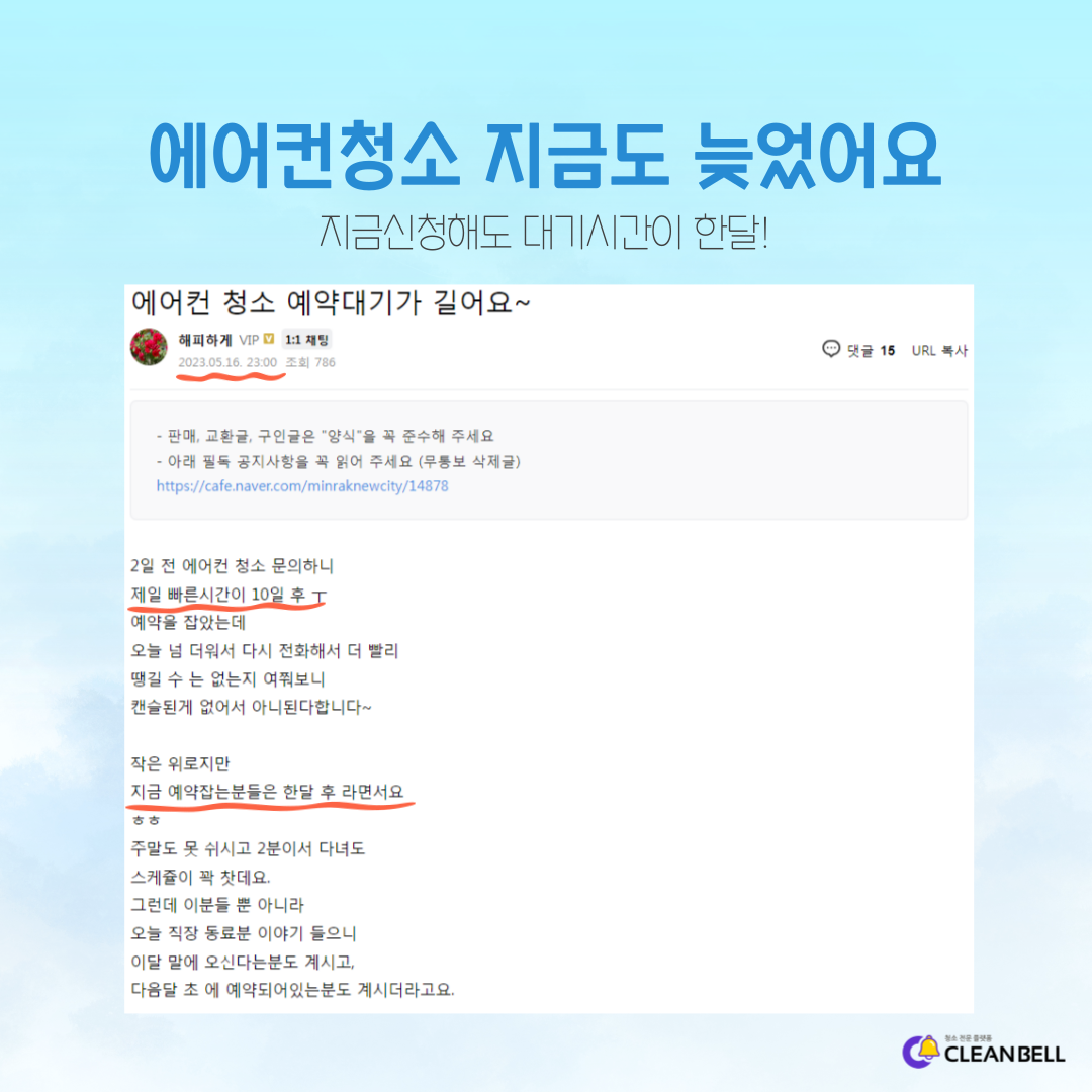 청소예약시 대기가 10일 이상에서 한달 까지 걸린다고 하는 글입니다.