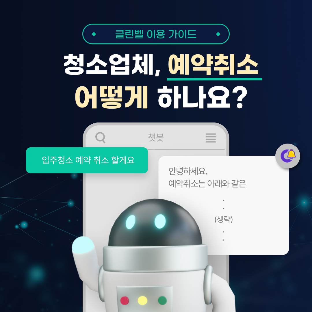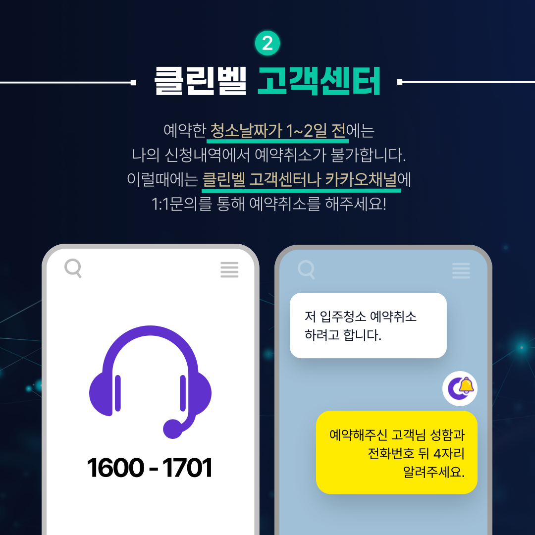이럴때에는 클린벨 고객센터나 카카오채널에 1:1 채팅 문의를 통해 예약취소를 해주세요!