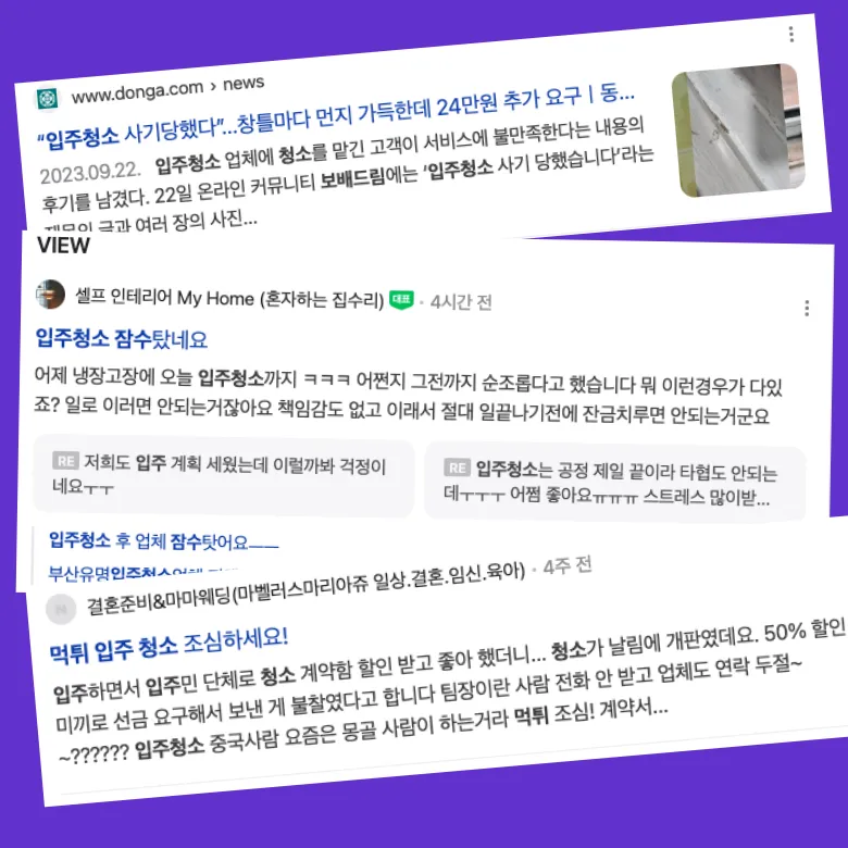 앞서 말했던 A/S / 계약금 먹튀 / 청소당일 잠수 / 과한추가비용 와 같은 문제가 생각보다 많이 발생한다.