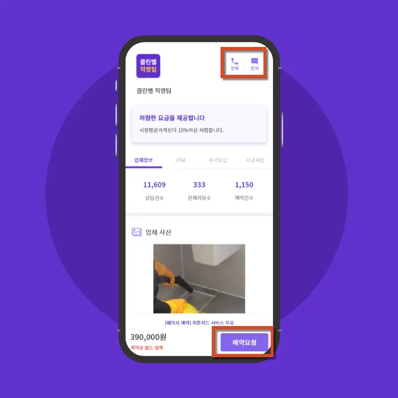 그 후 클린벨이 제공한 정보를 보고 천천히 살펴보고 필요하면 직접 청소업체에 전화나 문자로 문의를 할 수 있다.