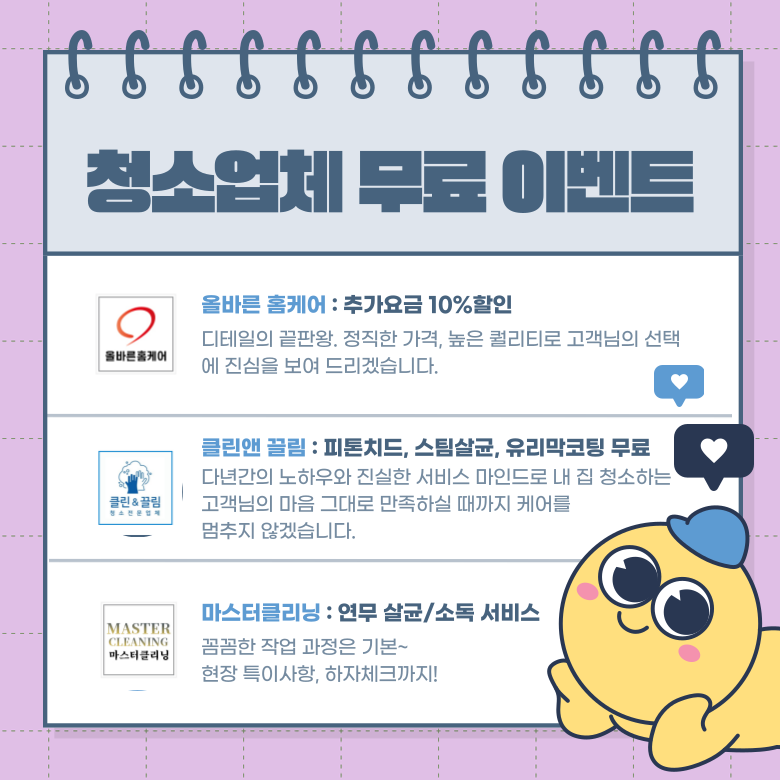 이달에 청소업체를 찾고 계신다면 꼭 참고하셔서 무료혜택 놓치지 마세요.