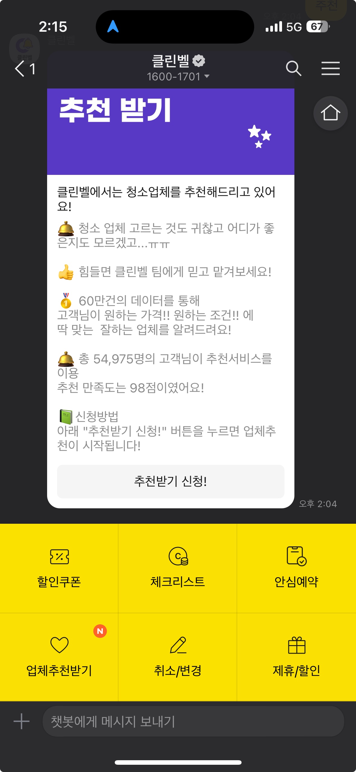 클린벨 카카오채널에서 '업체추천받기' 버튼을 눌러보세요!
