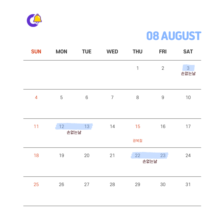 오늘은 24년 8월 손없는날은 언제인지 알아보는 시간입니다.