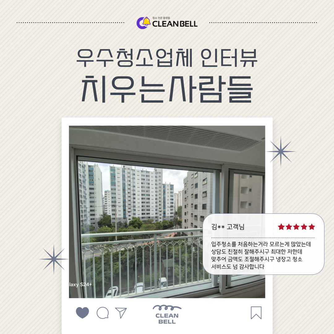 | 클린벨 인기청소업체 인터뷰 : 청소하개 (0) | 2024.09.19 |