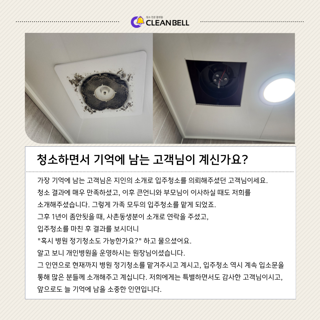그 인연으로 현재까지 병원 정기청소를 맡겨주시고 계시고, 입주청소 역시 계속 입소문을 통해 많은 분들께 소개해주고 계십니다.