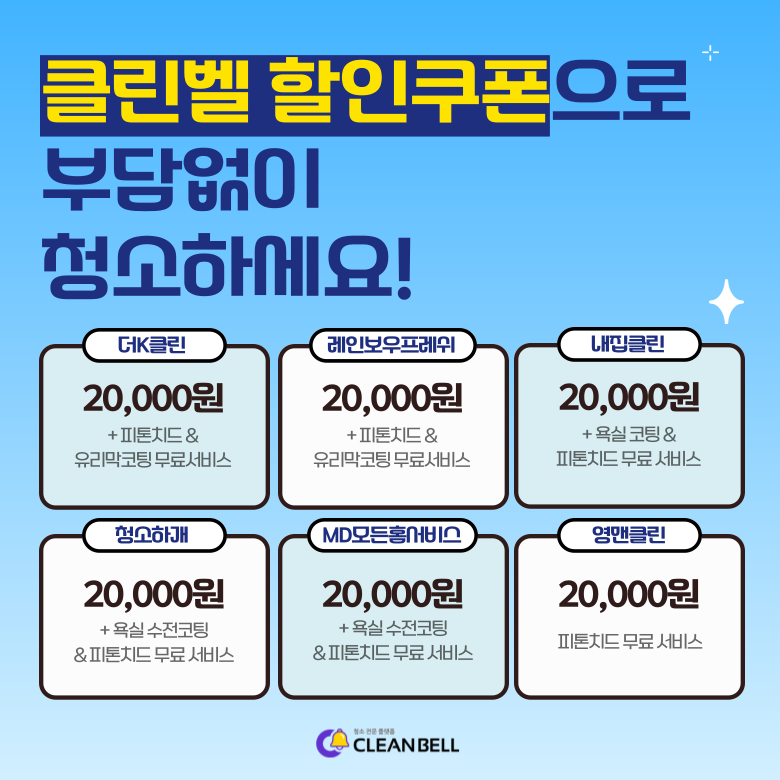 * 클린벨 할인 쿠폰은 클린벨 카카오톡 하단 > 할인쿠폰에 있습니다.